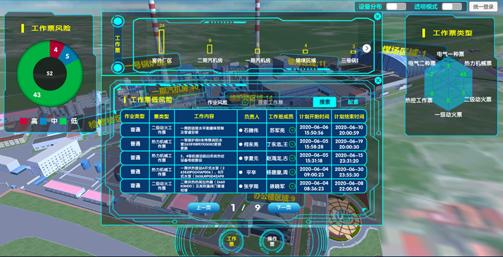 接入电厂的两票系统和缺陷系统数据,只筛选出当日正在执行的两票和未完成的缺陷。根据两票和缺陷的内容通过提前预设好的KKS编码和关键字关联到设备或者区域上,实现两票和缺陷分区域分布显示。将两票中风险等级高的进行报警显示,提醒安全管理人员注意。