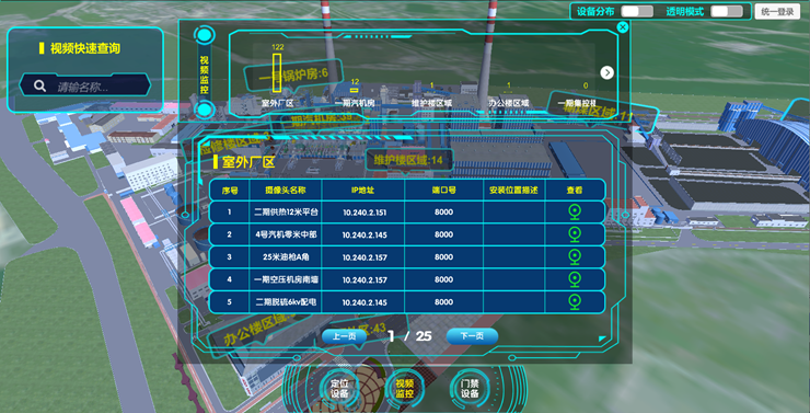 接入电厂现有的视频监控系统、门禁系统以及项目现场建设的定位设备,实现定位设备、视频监控设备、门禁设备的区域分布,三维可视化分布、设备快速查找、视频快速调取、门禁日志快速查询的功能。